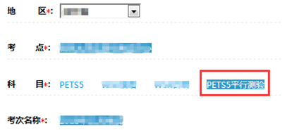 3.报名方式:打开报名页面,在科目选项中选择报考“PETS5平行测验”(仅限本次进行平行实验的考点)。考生选择报考“PETS5平行测验”成功,即表示“PETS5”报名成功。
